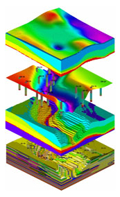 Stacked horizontal slices through a lithology model